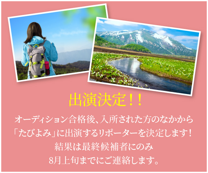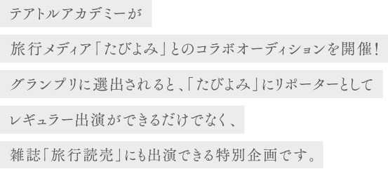 グランプリに選ばれた方は『たびよみリポーター』として、 旅ロケをしながら、話題のグルメやおすすめスポットを案内していただきます! その様子は旅行メディア「たびよみ」HP内コンテンツにてレギュラー掲載! さらに雑誌「旅行読売」にも出演ができる特別企画です。
