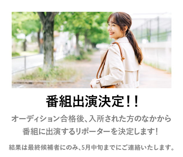 私がオーディションを受けたきっかけは、旅が好きで、出会いが好きだという理由もありますが、それ以上に、テレビで旅番組を視聴者としてワクワクしながら観ていた自分が、今度は誰かにその魅力を伝える立場になれるかもしれない――そんなチャレンジ精神からでした。