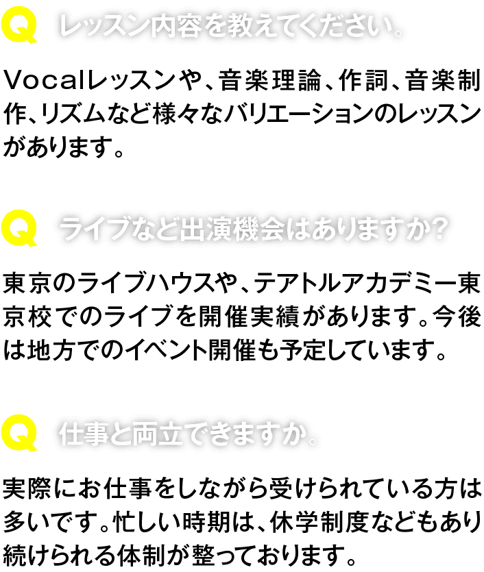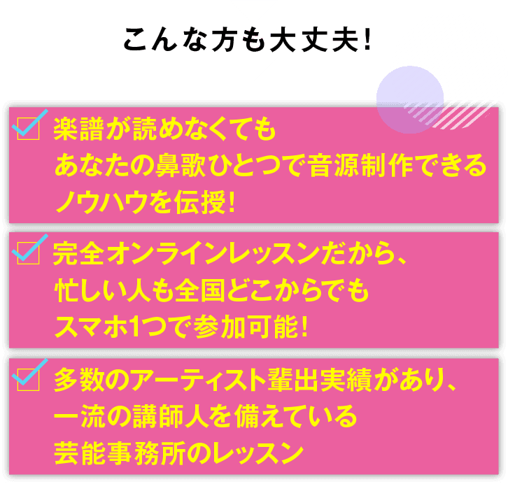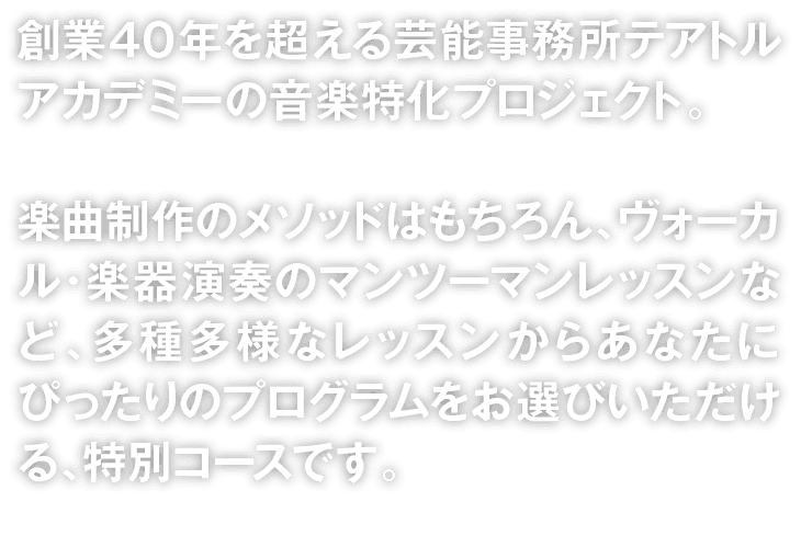 レッスン内容や芸能事務所ならではのバックアップに魅力を感じ、ここのレッスンを受けたい!と思いました。レッスン以外にライブのお話をいただいたり、実際に芸能界に携わっている方々のお話を聞いたりと、とても貴重な体験ができていると感じます。オンラインレッスンは自宅でも受講することができるので、仕事をしながらでも受けることができて非常にありがたいです。今後は音楽のスキルを伸ばすのと同時に、作詞作曲に取り組んでみたいと思います。